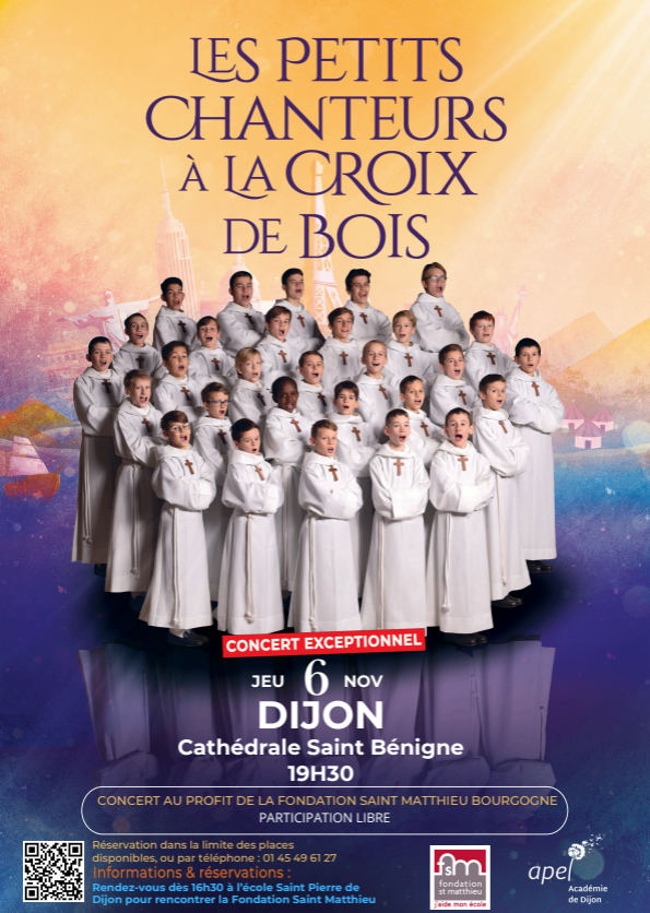 Rendez vous jeudi 6 novembre avec l’équipe de la Fondation Saint Matthieu Bourgogne et le Relais des Régions autour d’un verre partagé à 16h30 à l’école Saint Pierre, avant d’assister à un concert privé des Petits Chanteurs à La Croix de Bois. Rendez-vous à 19h30 à la Cathédrale de Dijon.